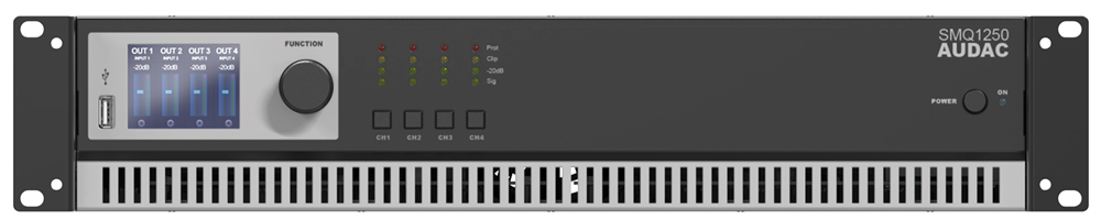 SMQ1250 - Четырехканальный низкоомный усилитель с DSP. Опционально предусмотрена установка карты интерфейса DANTE. Входы реализованы на разъемах XLR и Phoenix 3-Pin. Выходы - на разъемах Speakon и Phoenix 2-Pin. Передняя панель оборудована 2,5" LCD дисплеем с интуитивно понятным пользовательским интерфейсом управления интегрированным процессором DSP и портом USB для загрузки обновлений, а также пресетов для акустических систем.