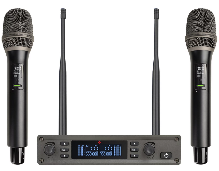 Axelvox DX800HT — высококачественная двухканальная беспроводная цифровая вокальная радиосистема профессионального уровня с DSP, состоящая из двух микрофонов и двухканального приемника. Станция способна анализировать эфир и автоматически находить оптимальные (свободные) частоты для работы. Расширенный частотный диапазон 650 - 758 МГц.