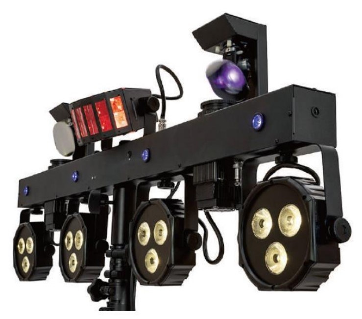 Это целая световая установка 4 в 1. Включает два сканера, один лучевой дискотечный эффект, четыре светодиодных прожектора направленного света и светодиодный стробоскоп, всё это на специальном штативе с пультом дистанционного управления и ножным беспроводным контроллером-педалью. В комплекте также идет чехол-сумка для транспортировки. Штатив регулируется по высоте 1,5-2,5 м.
