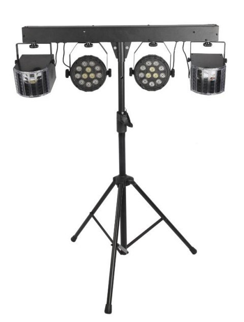 Это компактная световая установка для небольшой вечеринки, например дома, в небольшом кафе или на природе. Включает два светодиодных лучевых эффекта типа Agressor и два светодиодных прожектора направленного света типа LED PAR на специальном штативе с пультом дистанционного управления. В комплекте также идет чехол-сумка для транспортировки. Штатив регулируется по высоте. Каждый прибор может быть подключен через разъем TYPE-C, например к POWERBANK или через адаптер 5 В/2 А, это позволит использовать приборы, например на природе.